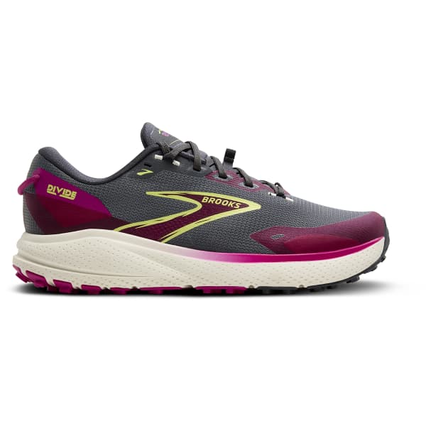 La DIVIDE 6 W de chez Brooks est une chaussure de trail pour femme qui présente une construction adaptée aux terrains inégaux.