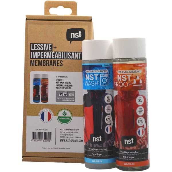 Le PACK DUO WASH 250ML + PROOF 250ML de la marque NST est un pack de contenant une lessive spécifique au lavage de softshell, Gore-Tex® ou autres vêtements techniques avec membrane imperméable et un imperméabilisant.